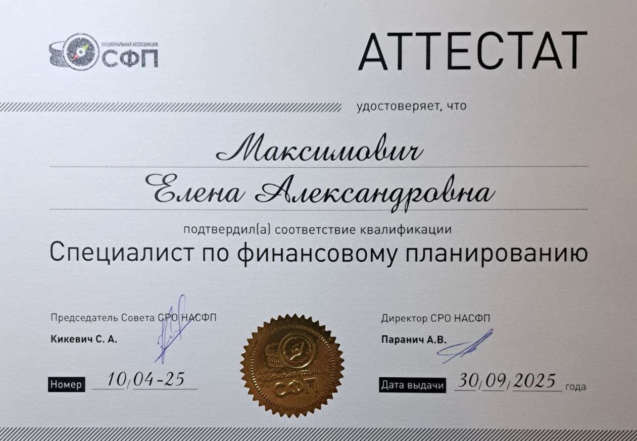 - Аккредитованный член СРО Национальная Ассоциация Специалистов Финансового Планирования (НАСФП);